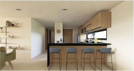 La cocina es abierta y equipada, cuenta con alacena y barra desayunadora.