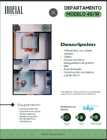 El concepto de INICIAL CORREA RACHO está compuesto de 144 departamentos de una y dos recámaras, más 28 Townhouses de dos recámaras en preventa para vivir o invertir, con precios desde $ 1’789,000.00 en segundo nivel. Todos construidos bajo el concepto EDGE (Excelencia en el diseño para una mejor eficiencia ambiental).