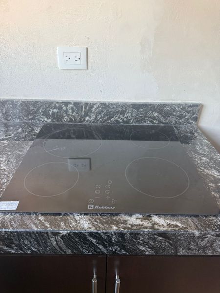 Cocina equipada: barra desayunadora, gavetas de madera, parrilla electrica empotrada, refrigerador