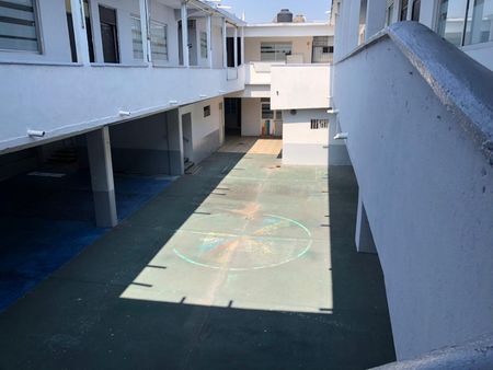 Cuenta con 18 espacios (salones), cubículos de oficina, baños separados para niño y niña y patio de recreo muy amplio.