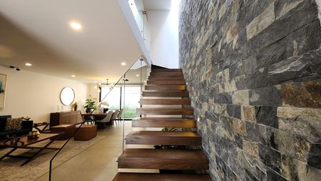 Escaleras flotantes con huellas de madera y barandal de cristal templado