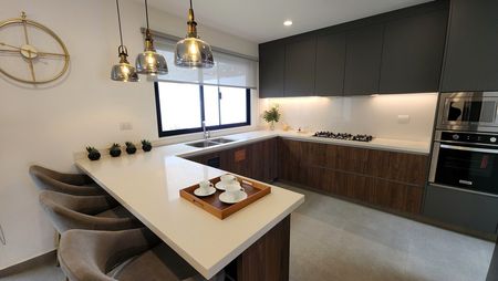 Cocina integral con cubierta en cuarzo, barra desayunadora y torre de hornos