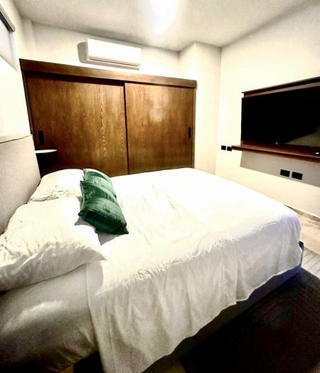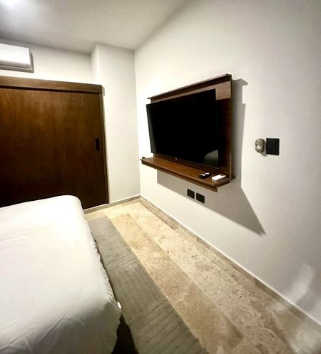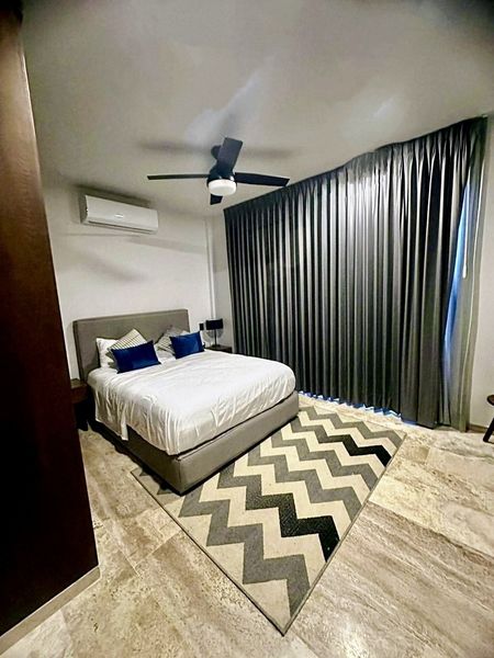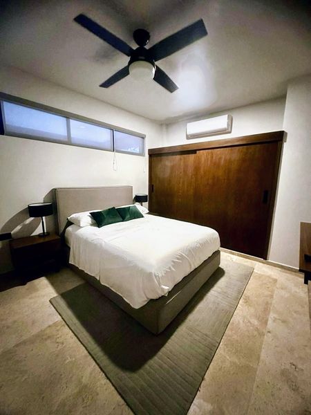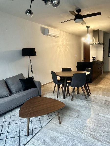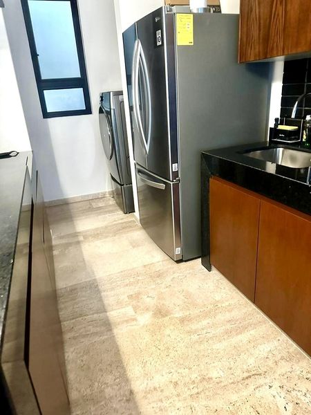 En Venta departamento en el complejo KUMA, un moderno conjunto de 45 departamentos, en la zona de Temozón en el norte de Mérida. Ubicado en la Planta Baja. Este departamento se VENDE AMUEBLADO y tiene 81m2 y consta de 2 recamaras y dos baños, sala comedor cocina integrados y un pequeño patio. Todo equipado con aires acondicionados, abanicos, cortinas blackout en habitaciones.
