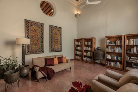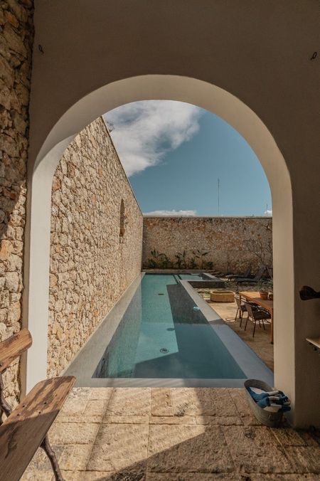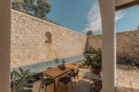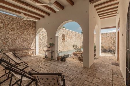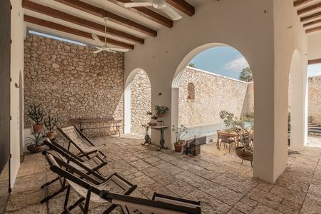 Esta exclusiva casa colonial de estilo mediterráneo cuenta con distintos niveles, con varias terrazas, amplio jardín que reúne grandes árboles y plantas tropicales, incluyendo tres especies de lirios acuáticos que florecen en un antiguo bebedero de una hacienda henequenera de la zona y una amplia alberca con un pequeño canal de nado.