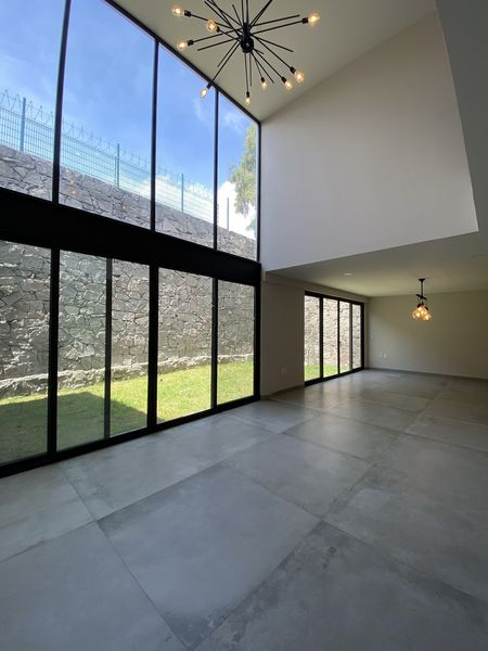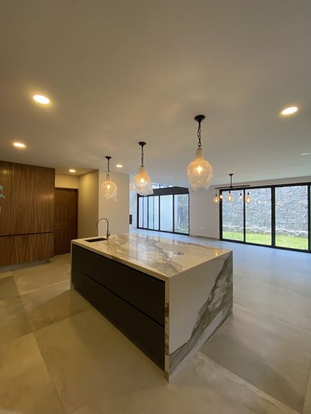 En la planta tiene un estudio, la sala de doble altura con chimenea decorada en piedra favorece para pasar tardes cálidas con vista 180o al jardín. La cocina con piedra tecnológica, lavavajillas, refrigerador Electrolux de doble puerta y lámparas Poterry Barn hará que sientas la comodidad y el lujo en todo momento.