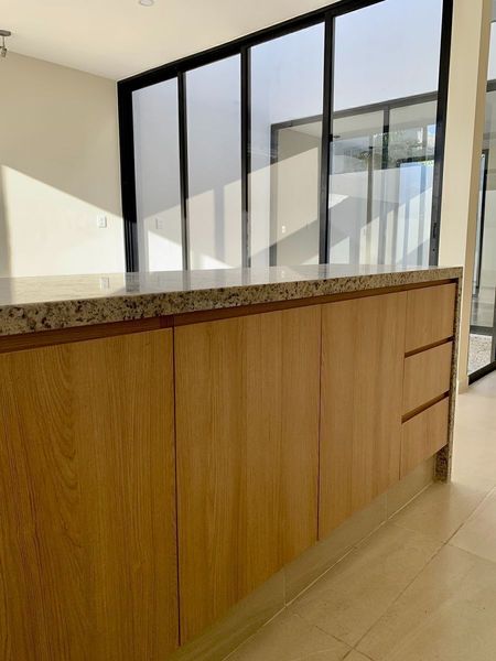 -Mesetas en mármol para baños completos. -Cocinas con granito en las mesetas y barra desayunadora, además de gabinetes bajo dichas mesetas.
