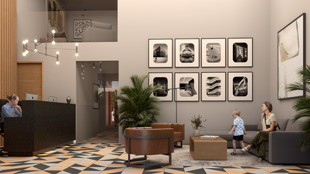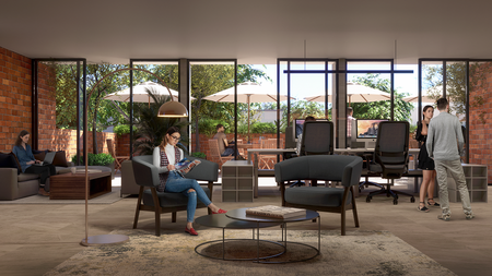 Tower B houses the complex amenities: a double‑height lobby on the ground floor, a coworking area with terrace on the first level, and on the fourth level, a rooftop terrace and additional lounge areas.