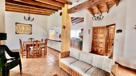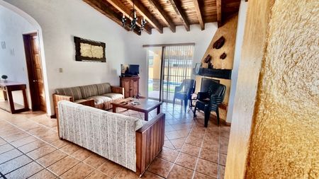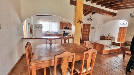 Casa de un solo piso con una distribución abierta de techos altos a dos aguas. además, de una casa de huéspedes independiente con dos habitaciones, terraza con asador Jardines y piscina.