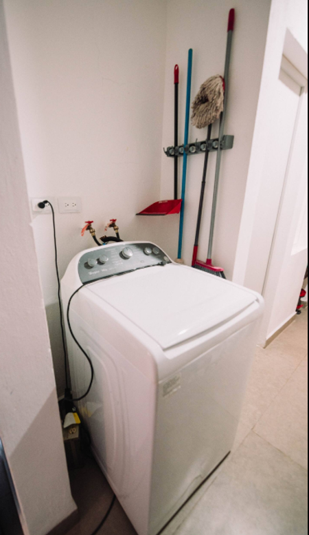 La casa cuenta con una cocina totalmente equipada que incluye cafetera, microondas, refrigerador y estufa eléctrica para preparar tus comidas favoritas. Además, dispones de una lavadora y espacio exterior con tendedero retráctil para tu comodidad.