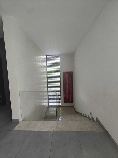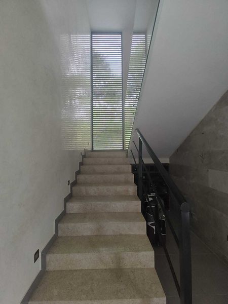 Escaleras de mármol con iluminación Barandal de vidrio templado.