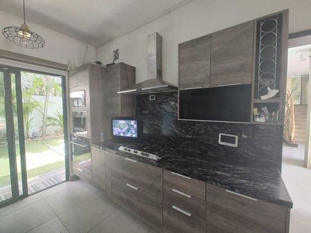 Cocina equipada con meseta de granito, 5 quemadores de gas, campana, horno de microondas, horno normal empotrado, cafetera .