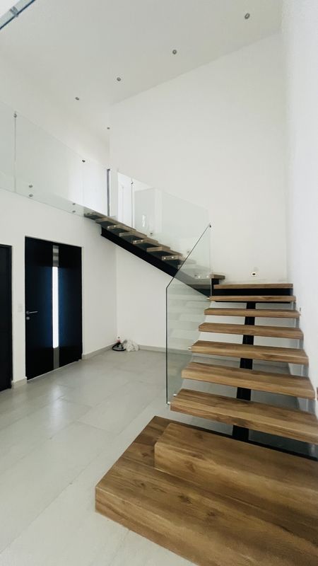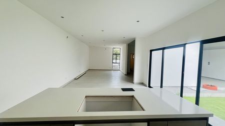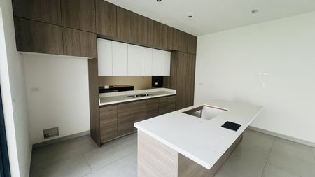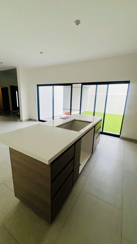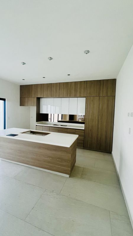Cocina de diseño con isla central y cubierta de cuarzo.