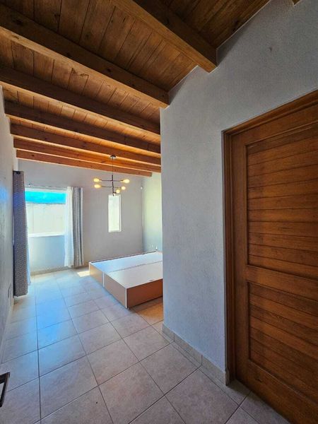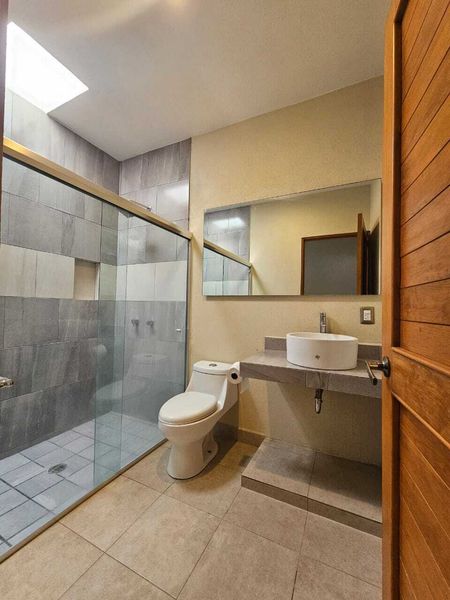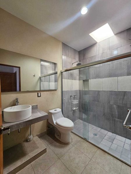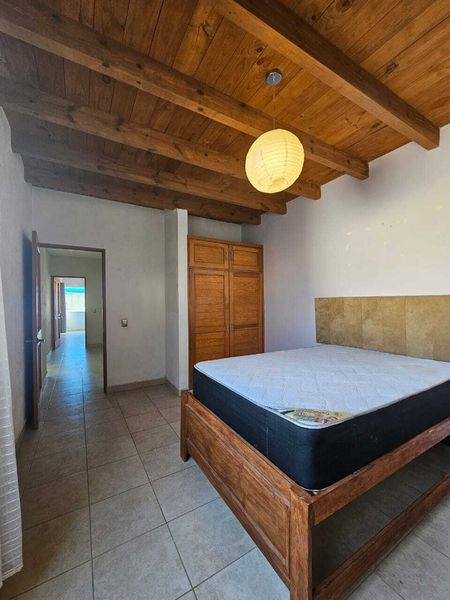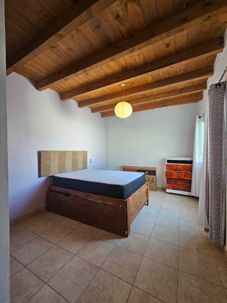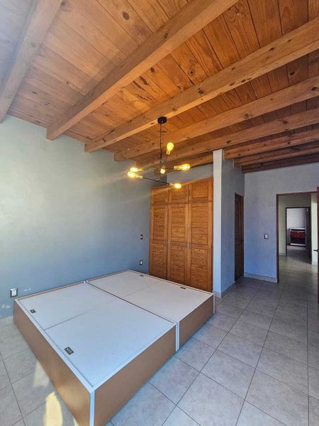 Habitación principal con baño completo y techo de madera