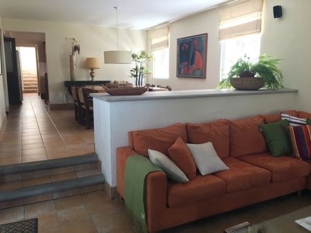 Cuenta con 3 recámaras todas con baño y vestidor, 2 con balcón, oficina, sala, comedor, salón de fiestas, hermosa cocina, amplia despensa, sala de TV, cantina, cava, terraza, baño de visitas, cuarto de servicio con baño, cuarto de lavado, patio de tendido, 2 bodegas y estacionamiento para 4 autos. Tiene un hermoso jardín que rodea la propiedad y colinda con área federal de 600m2 asignada al inmueble.