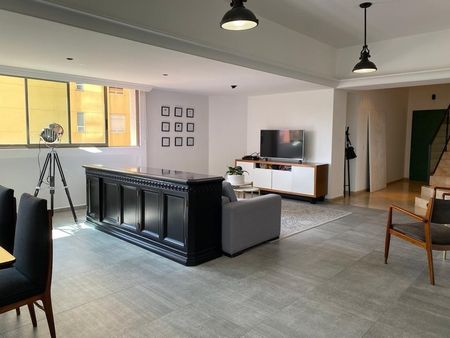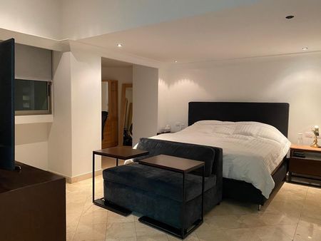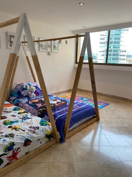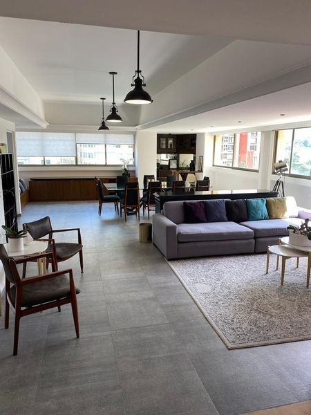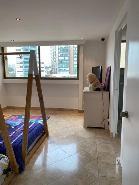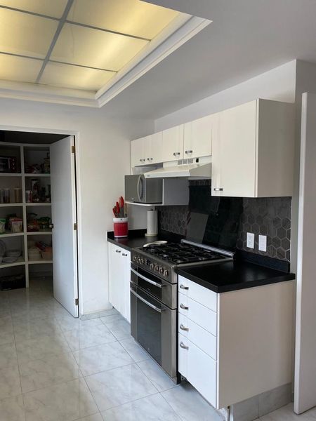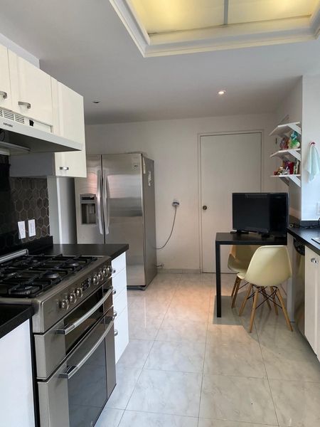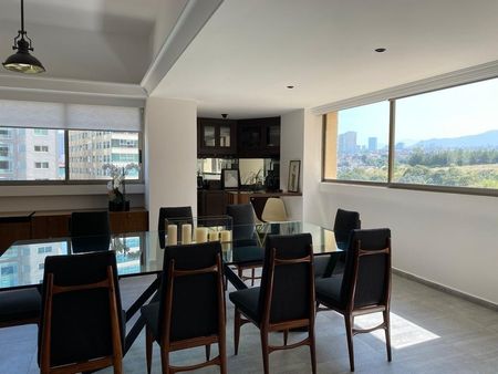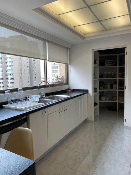Departamento de 258m2 en dos niveles, muy iluminado y calientito. En la planta baja está la cocina, cuarto de servicio completo y área de lavado, sala, comedor, en el segundo nivel están las 3 recámaras, cada una con su vestidor y su baño y una sala de tv. Tres lugares de estacionamiento y una bodega.