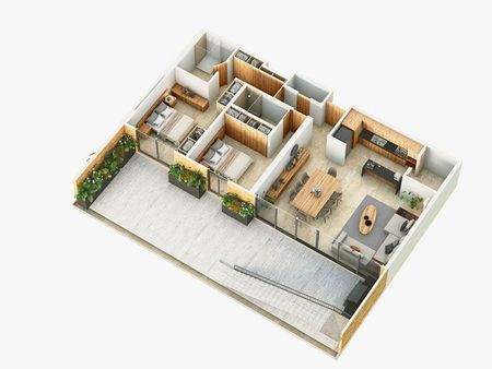 Cuenta con 2 recámaras, sala-comedor, cocina abierta, centro de lavado, dos baños completos y baño de cortesía.