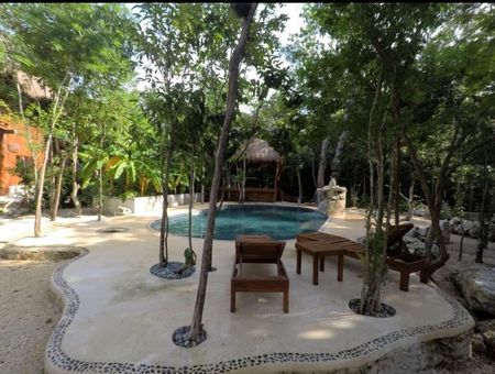 Cenote privado con áreas abiertas y encavernadas; el cenote puede mejorarse con escaleras y dragado, potenciando el atractivo natural del sitio.