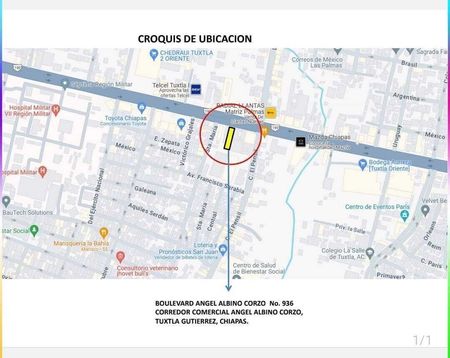 LOCAL COMERCIAL EN RENTA EN PLAZA COMERCIAL NUEVA, UBICADA EN LA AVENIDA PRINCIPAL QUE CONECTA DE PONIENTE A ORIENTE EN TUXTLA GUTIERREZ QUE ES EL BOULEVARD ANGEL ALBINO CORZO Y CASI ESQUINA CON CALLE EL PENSIL TAMBIEN CALLE PRINCIPAL DE ALTA AFUENCIA COMERCIAL , A 50 METROS SE ENCUENTRA EL RESTAURANTE BISQUETS DE OBREGON , ESTA ZONA CUENTA CON GRAN VARIEDAD DE OFICINAS PRIVADAS Y GUBERNAMENTALES , RESTAURANTES , CAFETERIAS , ZONA DE HOSPITALES, UNIVERSIDADES , AGENCIAS DE AUTOS . Y ESTA RODEADA DE COLONIAS RESIDENCIALES COMO LO SON EL RETIRO, LA SALLE, LAS PALMAS ENTRE OTRAS .