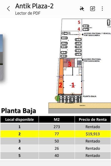 ESTA PLAZA CUENTA CON UNICAMENTE 2 NIVELES, TIENE ESTACIONAMIENTO PARA 21 AUTOS, Y COLINDA CON UNA GASOLINERA.