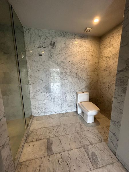 Baño de mármol travertino con puertas de regadera de cristal templado.