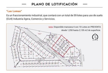 FRACCIONAMIENTO INDUSTRIAL, CUENTA CON UN TOTAL DE 59 LOTES PARA USO DE SUELO (CU4) INDUSTRIA LIGERA, COMERCIO Y SERVICIOS