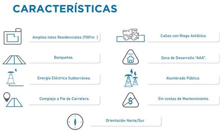 Es una zona de desarrollo AAA que contará con alumbrado público, banquetas, orientación Norte/sur, energía eléctrica subterránea , calles de riego asfáltico, sin cuotas de mantenimiento.