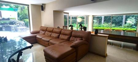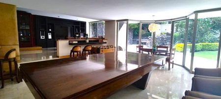 Consta de linda estancia, sala comedor con grandes ventanales y vista al jardín, cantina con barra y cava, cocina integral con isla al centro y desayunador, family room, 2 baños de visitas, 4 espaciosas recámaras todas con baño y vestidor, la principal además con espacio para integrar una cómoda salita, salón de juegos, terrazas, despacho, bodega, cochera techada para 8 autos, 2 cuartos de servicio con baño.