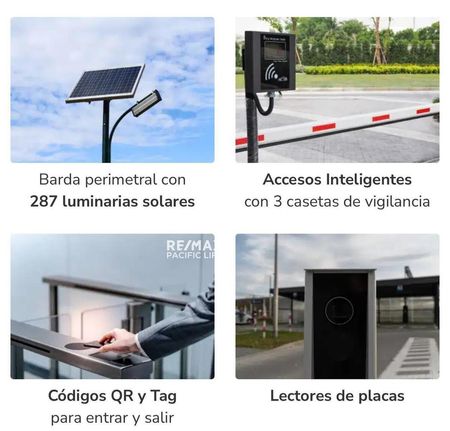 Cuenta con barda perimetral con luminarias solares, acceso inteligente con 3 casetas de vigilancia, códigos QR y Tag para entrar y salir, Lectores de placas, CCTV, Acceso con bolados.