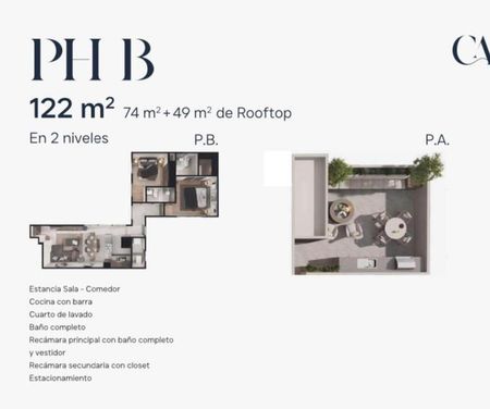 Este acogedor y bien distribuído departamento cuenta 68m2 con 2 amplias recámaras, la principal con baño amplios closetss, 2 baños completos de buen tamaño, acodedor roofgarden privado con asador, baño y área de lavado y con acceso desde el interior de 45.10m2 , así como roofgarden general y estacionamiento a piso, lobby de acceso y caseta de vigilancia.
