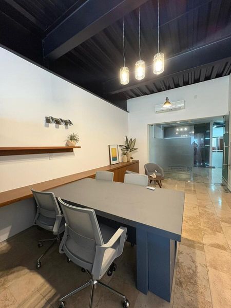 * **Mesa grande** con capacidad para 8 sillas (ideal para juntas).