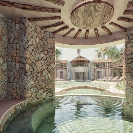 Un concepto de mar interior en el complejo con su alberca con diseño orgánico y arena en la orilla de la misma. Jacuzzi en el área de alberca con cortina de agua para exaltar la experiencia de paz, tranquilidad, relajación.