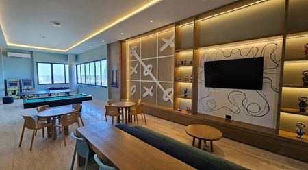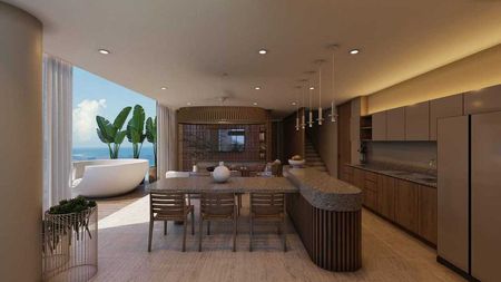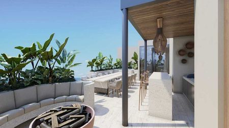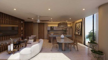 Sala comedor con terraza y un rooftop con bar, alberca y asoleaderos.