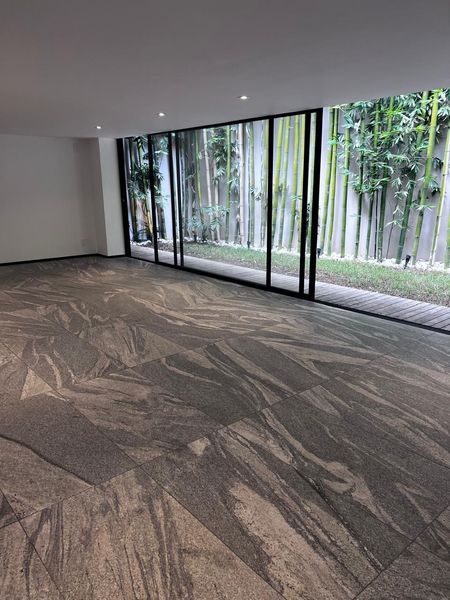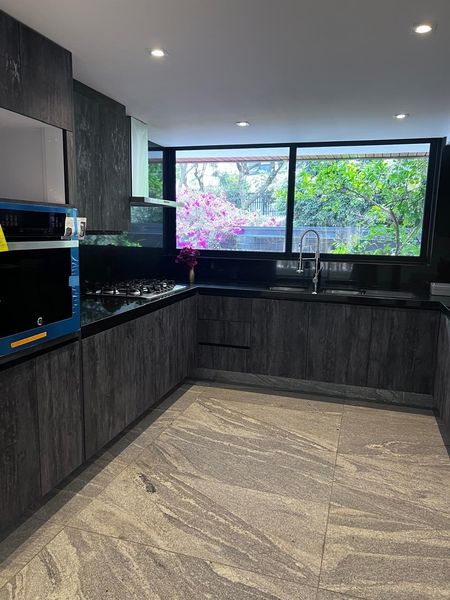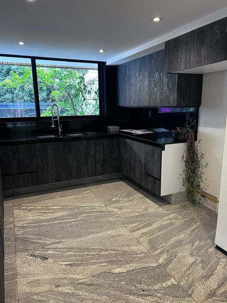 Acceso principal a través de jardín frontal con fuente, espectacular sala y amplio comedor así como cocina integral en concepto abierto, equipada con estufa, horno y cubiertas de granito, baño de visitas y estudio con salida al jardín.
