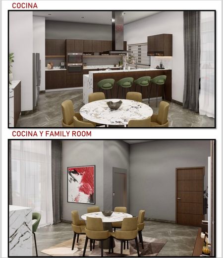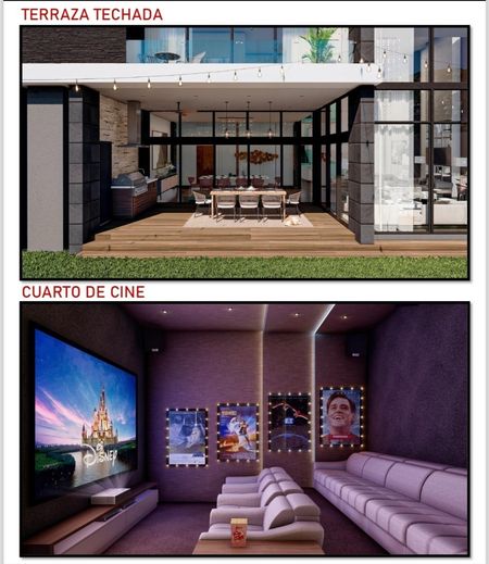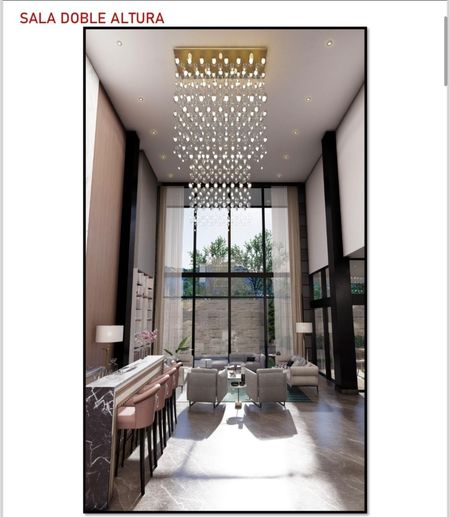 Cochera para 4 autos, acceso principal y doble altura en sala y bar, comedor, cocina integral con family room, despensa, baño completo de visitas, sala de cine/estudio/oficina, opción a cuarta recámara, terraza techada con barra cubierta de granito con tarja y preparación de asador, jardín exterior con baño completo, pasillo de servicio, lavandería, cuarto de servicio con baño completo, cuarto de máquinas, nicho de boilers y alberca. Preparación de elevador.