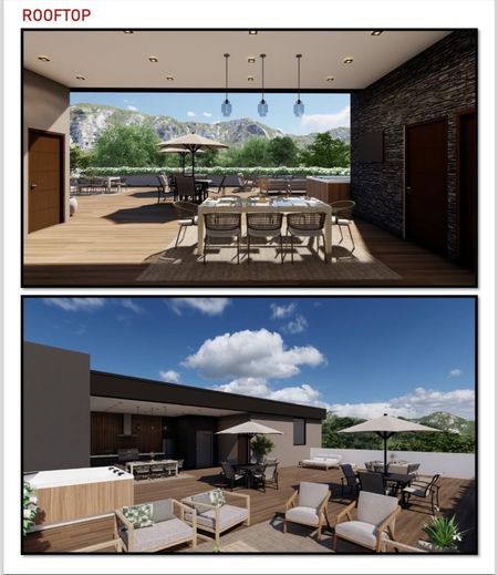 Cubo escaleras y elevador para acceso a azotea, terraza techada, baño completo, área social exterior , barra cubierta de granito con tarja y preparación de asador y refrigerador, bodega