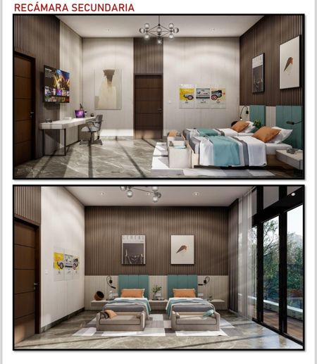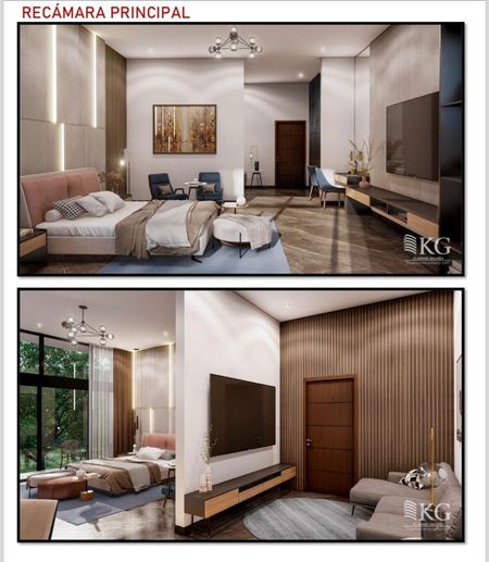 Recámara principal con balcón, baño completo con hidromasaje y walk-in closet de 2 niveles. Tres recámaras secundarias con balcón, baño completo y walk-in closet cada una, estancia/sala TV, closet de blancos y sink.