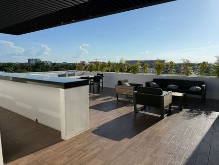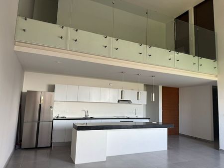 El departamento cuenta con 2 recamaras, la principal con closet vestidor, sala-comedor a doble altura, cocina equipada, en planta alta, mezannine, area de lavado y terraza.