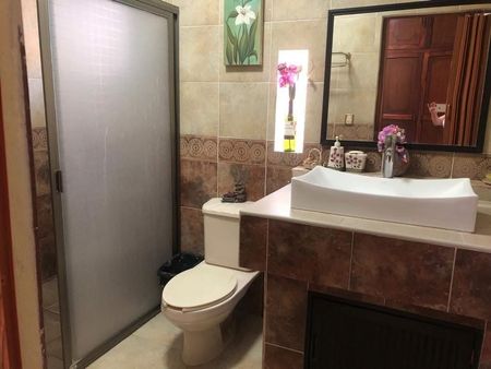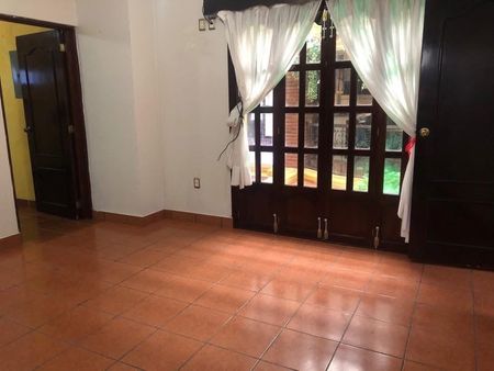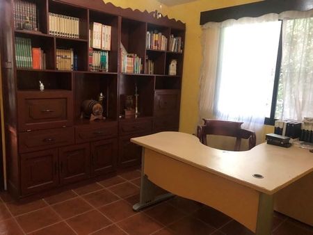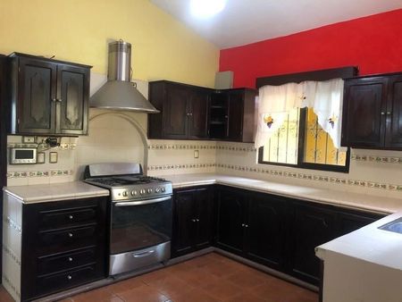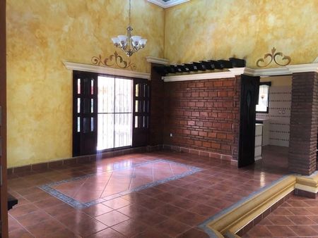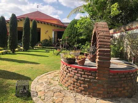 Casa en renta o venta estilo mexicano, construida en un terreno de 862.5 m² la vivienda tiene 237.86 m² de construcción en una sola planta, goza de un amplio jardín con árboles frutales y pozo, todo en un ambiente campirano dentro de la ciudad, con vías de acceso rápido a centros comerciales, escuelas y tiendas de autoservicio.