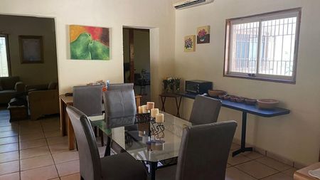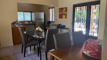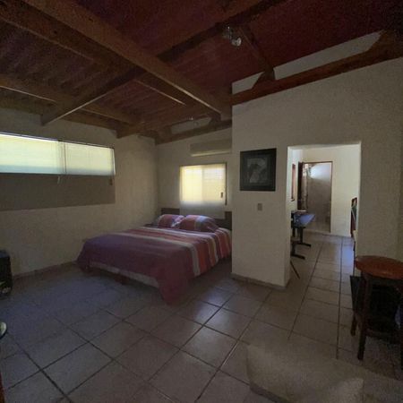 Casa con cocina, comedor, sala, dormitorios con cama principal, cama individual, baño interior, baño exterior.