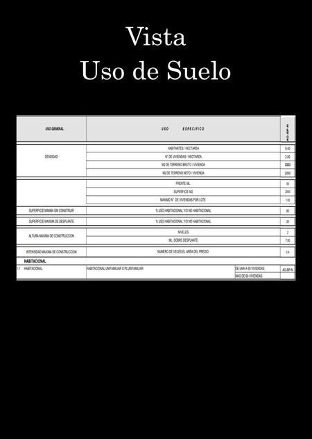 DENSIDAD 2 viviendas x ha ; Se podrán autorizar subdivisiones de predios cuando las fracciones resultantes tengan como mínimo 2000 m2 de superficie y un frente de cuando menos de 50 ml. • ALTURA Las edificaciones podrán tener una altura máxima sin incluir tinacos de 2 niveles o 7 ml. • AREA LIBRE Deberá dejarse como mínimo 80 % de la superficie del lote sin construir y una superficie construida equivalente a 0.4 veces la superficie del lote. • USOS ESPECIFICOS: Rastros/ estaciones de servicio (gasolineras) / estación de almacenamiento gas lp y gas natural / escuelas e instituciones tecnológicas / canchas descubiertas en general / clubes campestres, campos de tiro, campamentos, paradero de remolques, clubes hípicos y de golf / hoteles, moteles, casas de huéspedes, bungalós y posadas / extracción de minerales no metálicos/ agricultura / ganadería / captación y distribución de agua / instalaciones en general .