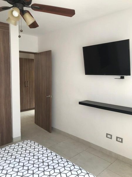 Recámara principal con cama King Size, TV, sábanas, edredón y ventilador