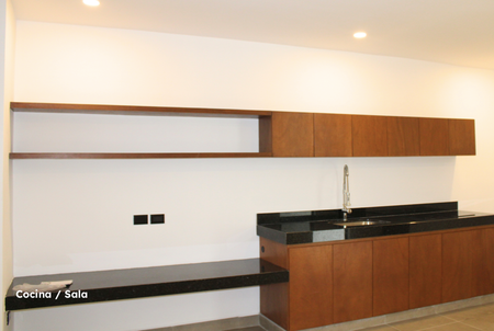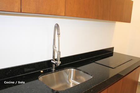 - Área de cocina equipada con refrigerador, tarja y estufa de inducción