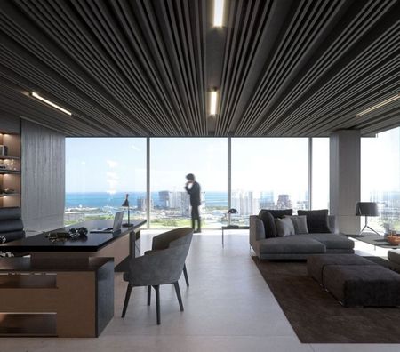 Los pasillos de acceso a la oficina cuentan con acabados finales como porcelanatos, plafones de panel de yeso y cristal templado en muros. Para el acabado exterior cuenta con cristal templado laminado.