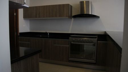 Cocina abierta vestida con muebles de melanina, con meseta de granito, barra desayunador y alacena