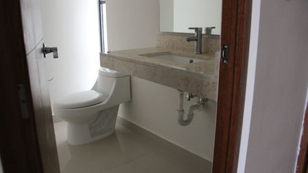 Recámara principal con balcón posterior, baño completo con doble lavabo y amplio vestidor con muebles de melanina.