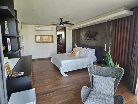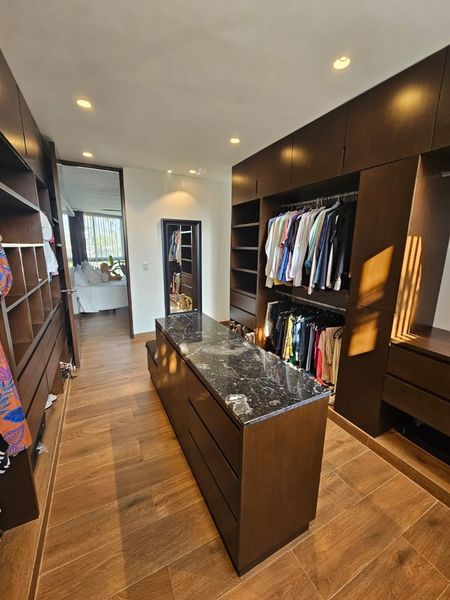 En la segunda planta, se ubican dos amplias recámaras, cada una con vestidores de madera, baño privado y vistas infinitas hacia las áreas verdes y el lago. Además, cuenta con un área de estudio ideal para home office o sala de lectura. En la planta baja, se encuentra la opción de una tercera recámara tipo suite, con baño completo y acceso a áreas de servicio independientes.