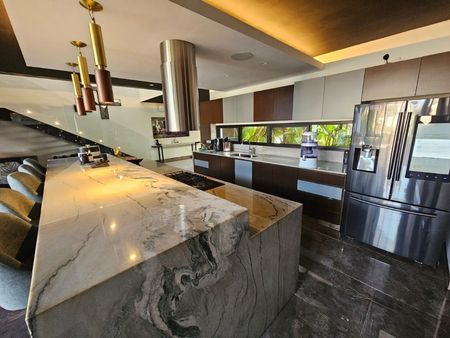 En planta baja, la propiedad nos recibe con un vestíbulo de triple altura que imprime carácter desde el primer paso. La cocina, abierta e integrada, conecta fluidamente con la sala y el comedor, ofreciendo un espacio social versátil que puede extenderse hacia un estudio o una sala adicional. Esta área se fusiona con una terraza a triple altura, donde se encuentra una segunda zona social con sala exterior, comedor, asador y piscina, todo enmarcado por jardines que descienden hasta el lago y sus fuentes.