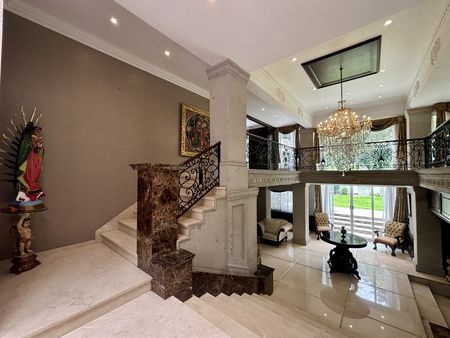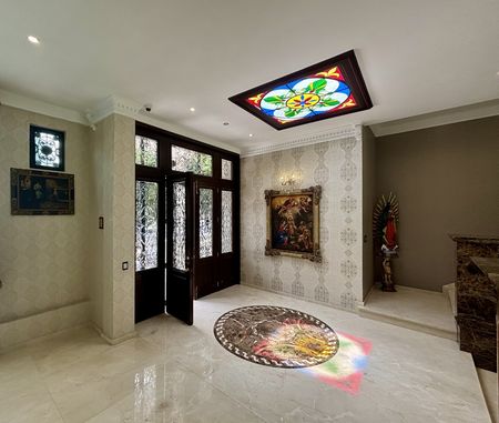 Descubre la propiedad de tus sueños en el prestigioso Club de Golf Bellavista. Esta residencia, con 900 m² de terreno y 1200 m² de construcción, te invita a vivir un estilo de vida de lujo inigualable. Su imponente fachada y los detallados acabados de cantera y herrería forjada son solo el preámbulo de lo que te espera en su interior. Disfruta de la elegancia del mármol en los pisos y la brillantez de los candelabros de cristal cortado, todo bañado por la cálida luz que se filtra a través de sus vitrales.