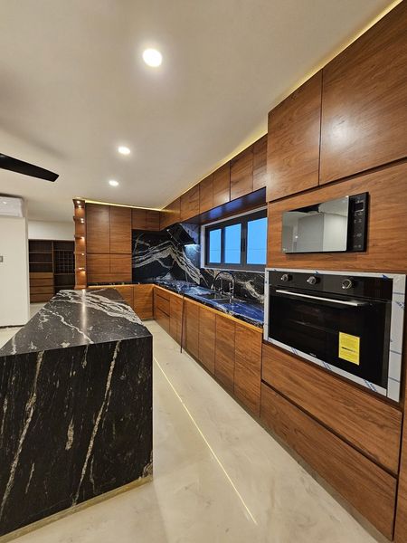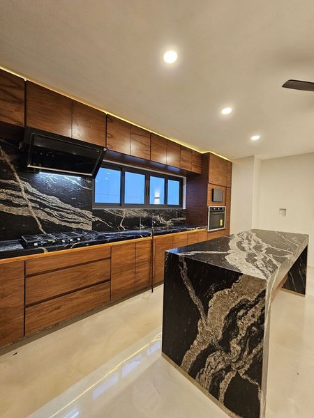 -Cocina integral con mesetas e isla recubiertas de granito Black Storm Leather