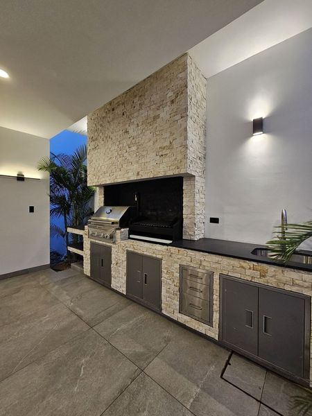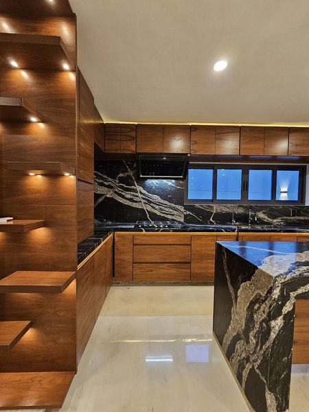 -Cocina integral con mesetas e isla recubiertas de granito Black Storm Leather